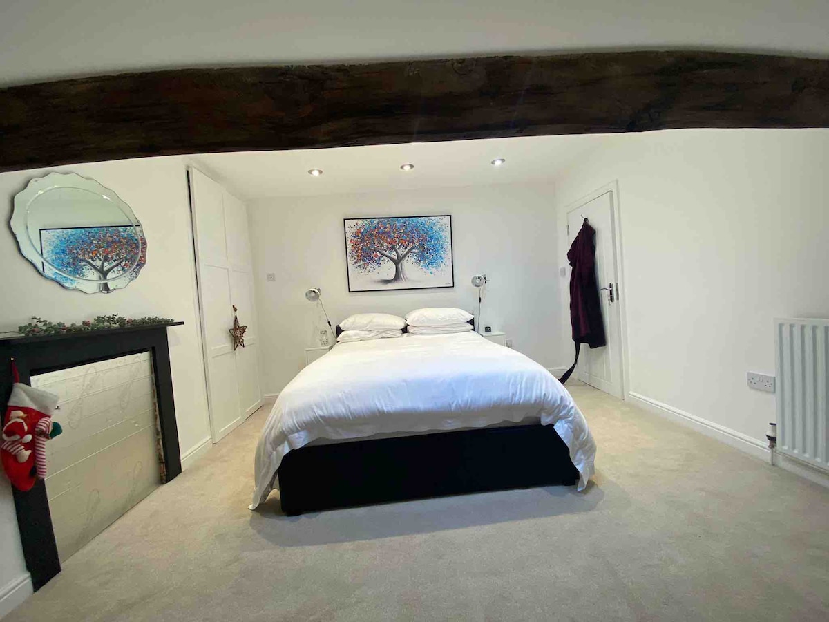 Ta det med ro på denne unike og rolige utflukten. Det er et over garasjerom med en stor balkong med utsikt til åpne marker. Den har alle fasiliteter, inkludert innendørs og utendørs spisesteder. Fullt utstyrt med: *TV *Mikrobølgeovn *Kokeplate *kjøleskap *Brødrister. *Te-/kaffefasiliteter. *Tilgang til vaskemaskin/tørketrommel etter avtale. Rommet er atskilt fra hovedhuset. Det er offroad-parkering på stedet. Ladested for elbil Det er en utmerket pub/restaurant av høy kvalitet innenfor fem minutters gange. Sentralt.