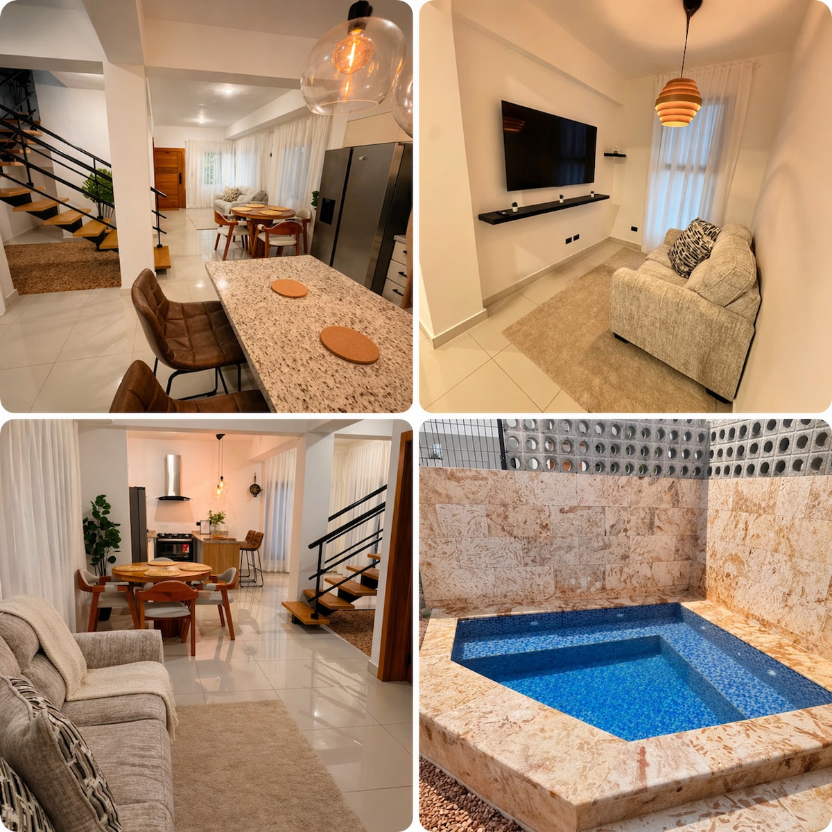 Cozy 3BR/3BA home in Downtown Punta Cana. With AC in all rooms + living, 2 Smart TVs, 300Mbps Wi-Fi, charging stations, kids’ games, and terrace with Picuzzi (no hot). Kitchen fully equipped, parking for 2 cars, 24/7 security, large pool, shared playground & outdoor gym. Essentials: water, body wash, shampoo, towels, cleaning supplies, coffee, sugar, salt. Just 3 min from Downtown & COCO BONGO, 12 min from airport, 15 min from beach.