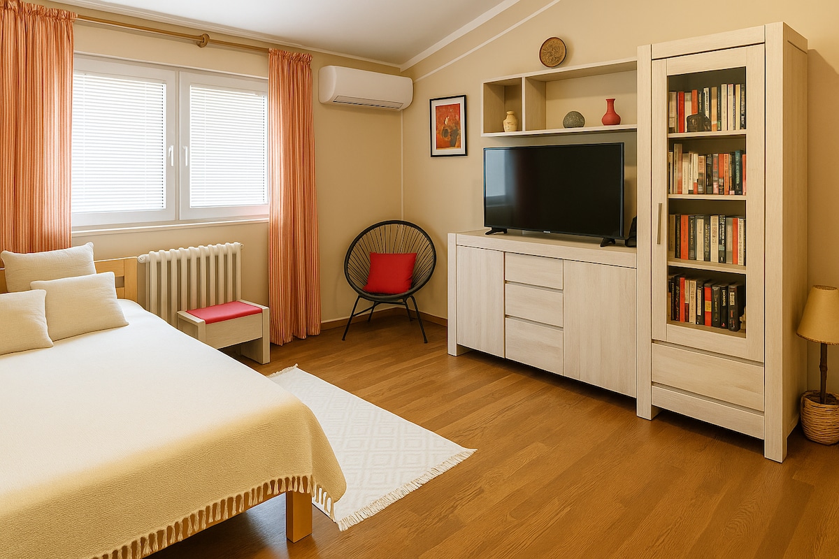 Her kan dere nyte et fredelig opphold i denne koselige leiligheten med ett soverom og en privat hage i hjertet av Dorćol. Stedet tilbyr en sjelden kombinasjon av rolig og sentral beliggenhet – ideelt for hjemmekontor eller bare for å slappe av mens du bor i nærheten av alt. Start dagen med kaffe i hagen, jobb med rask og pålitelig trådløst nettverk, og slapp av i rolige omgivelser bare noen skritt unna kafeer, restauranter og byens livlige steder. Et enkelt, velbalansert sted å nyte Beograd i ditt eget tempo.