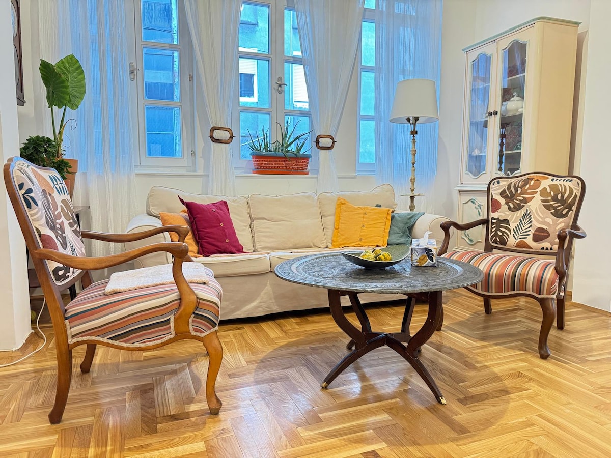 Velkommen til vårt andre hjem i hjertet av Beograd. Det er et sted vi har laget med kjærlighet og fokus på detaljer, og som forbinder moderne eleganse med et snev av 70-talls sjarm, designet for å være et fristed for familien vår på fem. Det var viktig for oss å ha et allsidig boareal på en eksepsjonell beliggenhet når vi besøkte familie og venner i hjembyen vår.