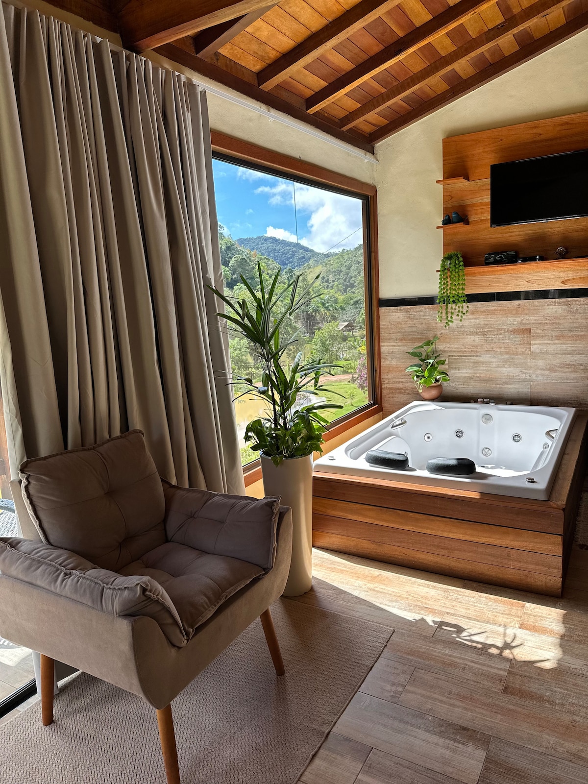 Slapp av i dette rolige og stilige rommet. Med en spektakulær utsikt midt i naturen, til lyden av elven og fuglene. Diskret og koselig. I det behagelige klimaet i Espírito Santo-fjellene. Kom og opplev utrolige øyeblikk i dette fantastiske hjørnet.