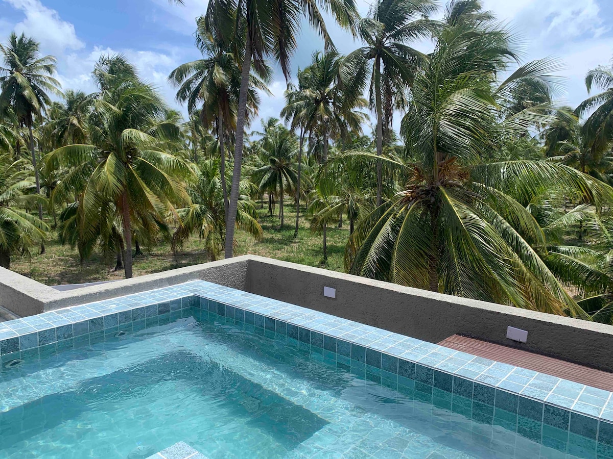 Plassert i en lukket selveierleilighet - MIRAKLER som står I AREIA - SJARMEHUS . Total sikkerhet og ro . Luksusbungalow med privat basseng. Ideell for bryllupsreise eller for deg som ønsker god smak og privatliv . Ligger ved havet i Praia do Toque, som er den beste stranden i São Miguel dos Milagres. Nabo til fantastiske restauranter. Jangadeiro fanger dem foran huset for å ta deg med på fantastiske spaserturer til de naturlige bassengene i regionen . Vi tilbyr frokost