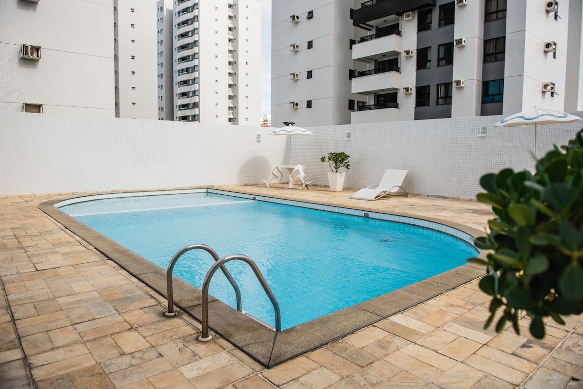 Ta med hele familien til dette flotte stedet med masse plass til å ha det gøy. Du kan bruke bassenget, men hver mandag er det stengt for vedlikehold. I leilighetskomplekset er det et treningssenter, badstue, biljardbord. Leiligheten har alle grunnleggende ting: kjøleskap, mikrobølgeovn, komfyr, vaskemaskin, blender, TV, luftkondisjonering, sengetøy og håndklær, Wi-Fi og mye mer. Du kan gå til stranden, det er en veldig god beliggenhet for å bestille iFood, apoteklevering og mer, du kan gå til barene på Passarela do Caranguejo.