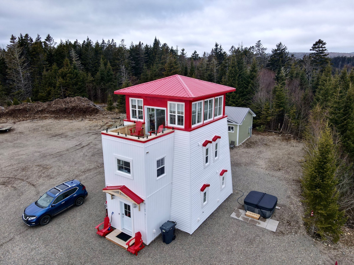 Hytta er formet som et fyrtårn og ligger på bakken over Fundy-bukten. Den har ett soverom og er et koselig tilfluktssted som fanger essensen av livet ved kysten. Høydepunktet er stuen i øverste etasje, hvor panoramavinduer rammer inn det vakre sjølandskapet. Fra dette høye utsiktspunktet kan gjestene slappe av i den varme stuen mens de nyter utsikten over sjøgrottene, og skaper et rolig og pittoresk tilfluktssted suspendert mellom land og sjø. Bare en rask spasertur nedover bakken til stranden.