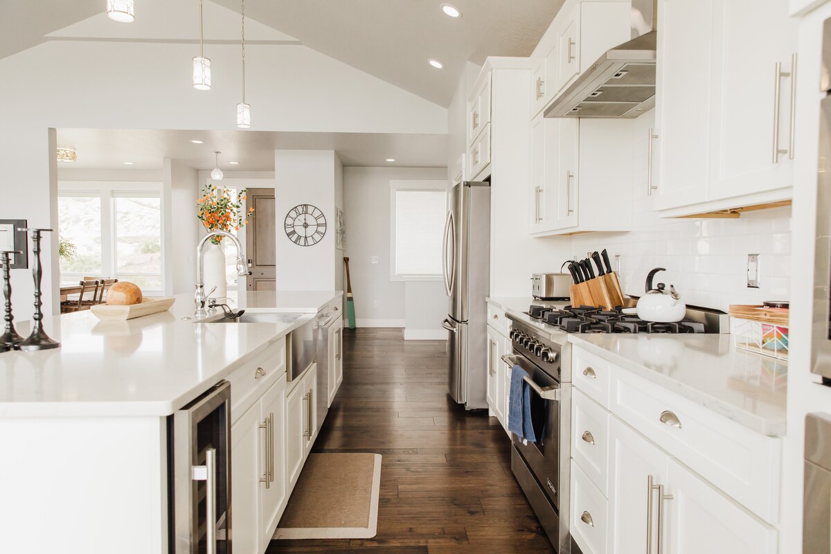 The Modern Farmhouse was recently remodeled with upscale amenities and everything you need for a comfortable stay! Enjoy your own delicious home cooked meals in the beautiful kitchen, gather in the dining room with seating for 8, enjoy a movie on Netflix or Disney+ on a huge 65" OLED 4K TV and 7.2 Klipsch Surround Sound with a large sectional providing seating for the whole family. Outside on the back patio you will find outdoor seating with a fire pit, a hot tub for 5, and a 6 burner BBQ.