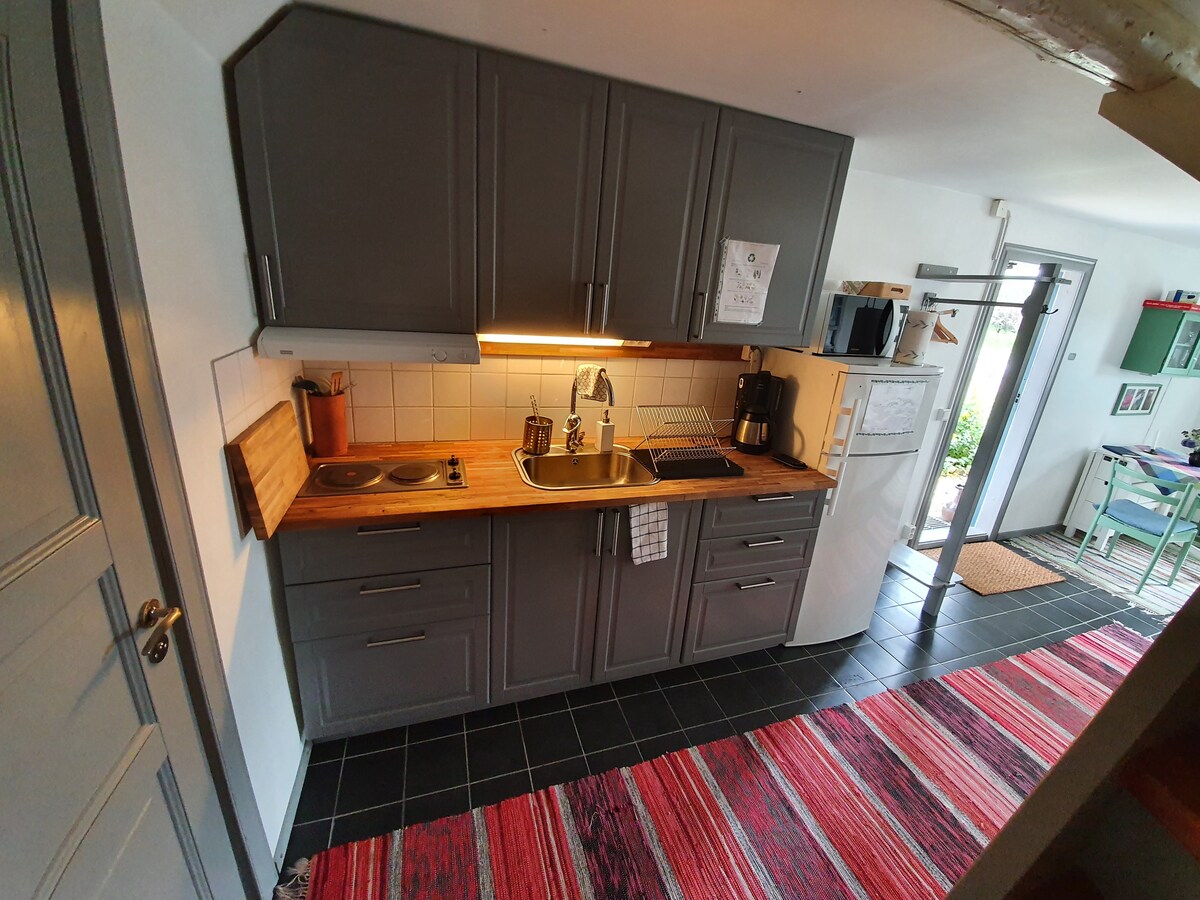 Vakkert landlig beliggenhet like utenfor Röstånga. Funksjonelt og friskt. Du har to etasjer på ca. 25 kvm bygget i gavlen på en låve helt for deg selv. Soverommet ligger en etasje opp, men trappen har ikke noe rekkverk. Kjøkkenet har to kokeplater, kjøkkenvifte, mikrobølgeovn, kaffetrakter, vannkoker og kjøleskap med fryser. Ingen ovn. Fullt utstyrt med kjøkkenutstyr. Sofasengen står i første etasje, og er dessverre ikke så behagelig å sove i. MERK: Håndklær, laken og rengjøring er inkludert!