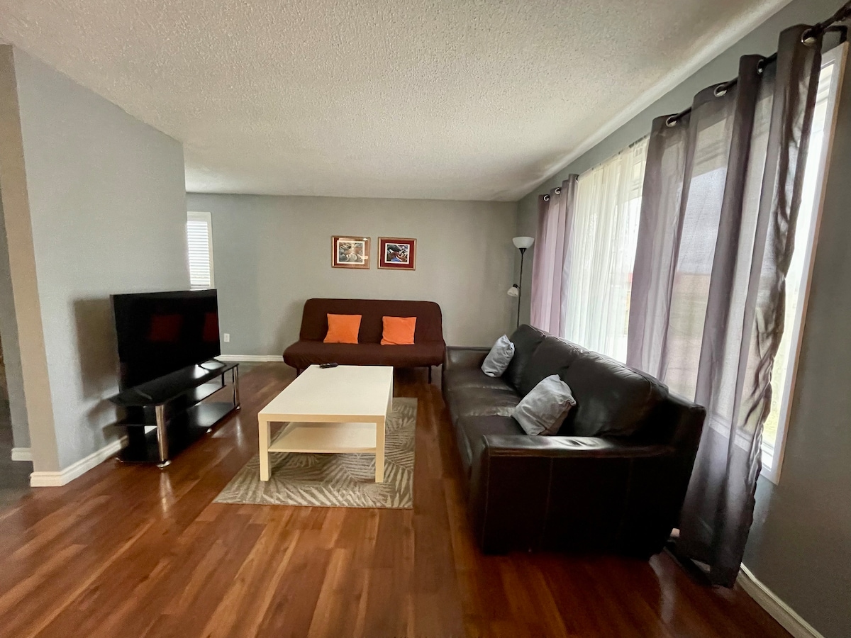 Føl deg som hjemme på dette romslige og rolige stedet. Bare 3–5 minutters gange unna gatekjøkken, restauranter, shopping, parker og Stettler sykehus. Se på film på 70-tommers TV-en eller bare nyt utsikten over en frukthage gjennom de store vinduene. Ideell for både langvarige og korte opphold. Vaskemaskin og tørketrommel pluss et stort kjøleskap. Sov på to queensize-senger fra Serta. Opplev luksusen med mindre penger.