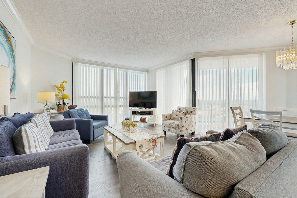 Elegant leilighet med ett soverom og to bad på Majestic Sun med fantastisk utsikt over golfen fra den romslige balkongen i 10. etasje. Stilig møblert med et kystpreg, har den en kingsize-seng, eget bad, køyesenger i gangen med egen TV med Netflix, og en queensize-sovesofa. Nyt et komplett kjøkken, raskt trådløst nettverk og TV i alle rom. Ligger i A-bygningen i nærheten av overdekket parkering med enkel tilgang. Gjester kommer tilbake år etter år for hav- og strandutsikten, komforten og den uforglemmelige strandopplevelsen.