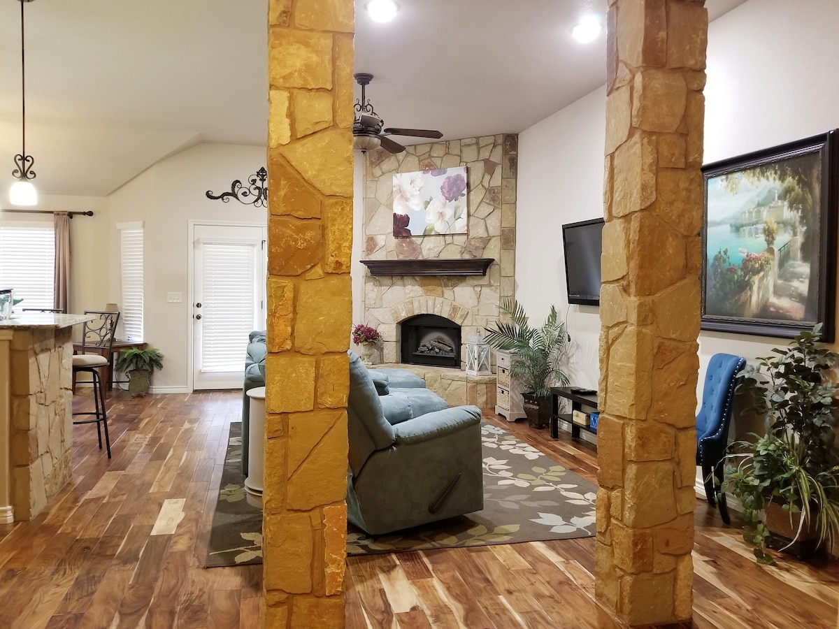Hjem i middelhavsstil i et nabolag med utsikt over bakgården. I nærheten av Fort Hood/shopping. Gratis flaske vin! Kontorplass. Kingsize seng, dusj/badekar (ingen boblebad). To queensize-senger. Tre TV-er med Roku for strømming. Keurig (K-Cups inkludert), kjøleskap i full størrelse OG minikjøleskap, to terrasser med sitteplasser, gassgrill (engangsgebyr på 15,00 for bruk). Elektrisk LR-peis. Trådløst nettverk. INGEN KJÆLEDYR. Utvendig belysning/utendørs kameraer på eiendommen for sikkerhet. Tredemølle på forespørsel.