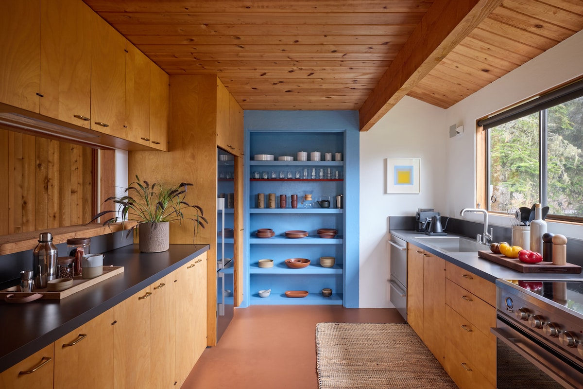 Dette nyoppussede hjemmet ligger bortgjemt i redwood-skogen og er et fredelig tilfluktssted på Sea Ranch. Det har nesten totalt privatliv på tre hektar skog, pluss lyden, lukten og synet av havet gjennom et hull i trærne på en klar dag. Hovedrommet og hovedsoverommet er romslige, med utsikt mot skogen fra alle vinkler. Huset har fiberoptisk internett og har tilstrekkelig plass til at to personer kan jobbe hjemmefra veldig komfortabelt. Flere bilder på IG: @theseaforesthouse. TOT 3398N.