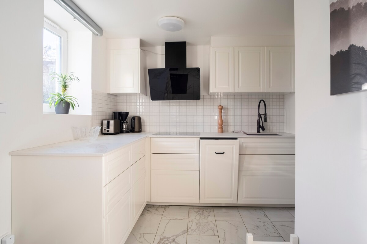 Fullt møblert, vakker studioleilighet i en villa i et fredelig område. Studioet ligger bare 20 minutter fra sentrum. Studioleiligheten tilbyr overnatting for et par eller en enkeltperson, med en balkong med utsikt over hagen, ett soverom (seng på 140 x 200 cm), en stue og et godt utstyrt kjøkken med oppvaskmaskin og kjøleskap. Sofasengen i kjøkkenet/stuen kan gjøres om til en madrass på gulvnivå. Fullt utstyrt kjøkken med induksjonstopp, stekeovn, minikjøleskap, vannkoker og brødrister.