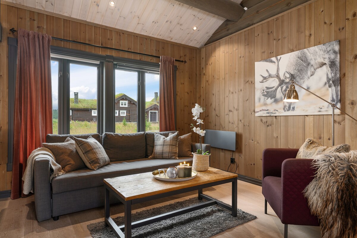 Den moderne og stilige hytta vår fra 2019 er omgitt av fjell, innsjøer, endeløse turstier og vakker natur 907 moh ved inngangen til Rondane nasjonalpark på Venabygdsfjellet. Dette området er fantastisk året rundt. Om sommeren kan du fiske, bade i de mange innsjøene, gå, sykle, padle i kano og ri. Høsten har flotte farger, og om vinteren kan du gå på langrenn i de endeløse og daglig vedlikeholdte skiløypene rett utenfor hytta.