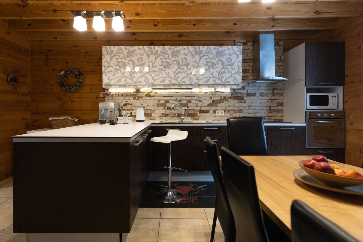 12 км від Києва! Новий затишний Еко-дім з басейном, сауною і чаном Дім 140 кв.м з карпатської смереки в котеджному містечку з охороною. В курортній зоні, 100 м притока Десни, велика гарна територія з сосновим лісом, барбекю, терасса, газон. Своя скважина, система фільтрації води - питна вода в кожному крані. Будинок з самих якісних і екологічних материалів. Телевізори 55 дюймов 4К. 2 ліжка Кинг-сайз, 8 спальных місць. Окрема баня на дровах і чан під додаткове замовлення