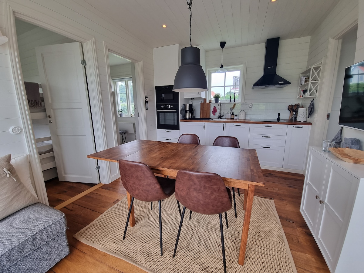 Lys, koselig hytte i fiskelandsby med utsikt over havet.