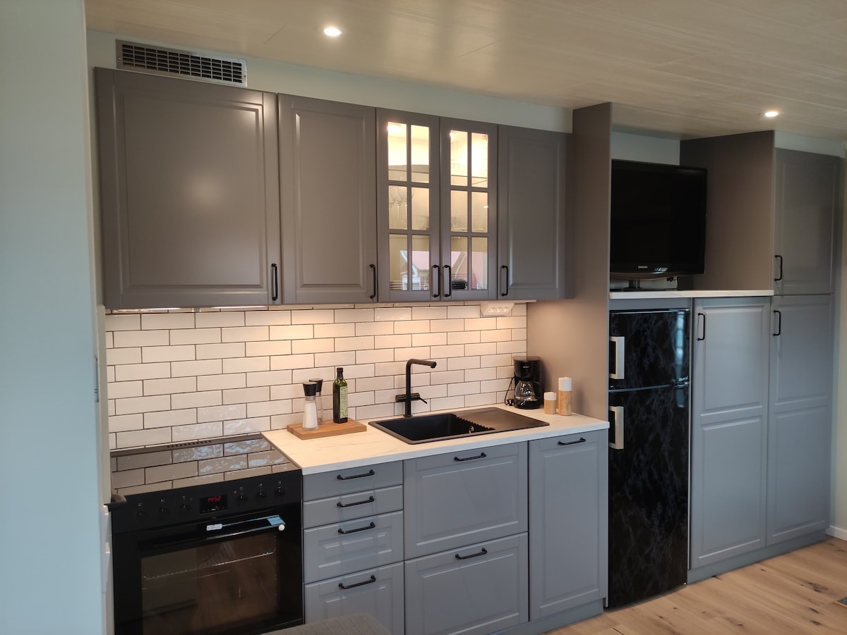 Sykl til byen -> 10 min. Hyggelig og moderne hytte.