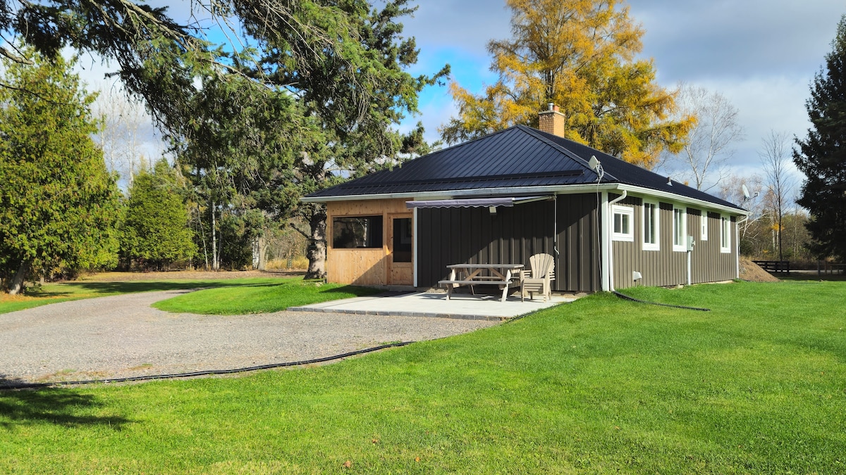 Come and unplug and reconnect at this secluded off-grid eco-friendly bio-responsible solar powered cabin on 91 acres of land 4 hours north of Toronto. The property includes 10km of private trails, forested areas, open clearings, beaver ponds and an abundance of wildlife. The cabin is adjacent to Crown Land with many trails for hiking, biking and snowmobiling and a nearby secluded lake. The property is 1.5 hours from Killarney Provincial Park.
