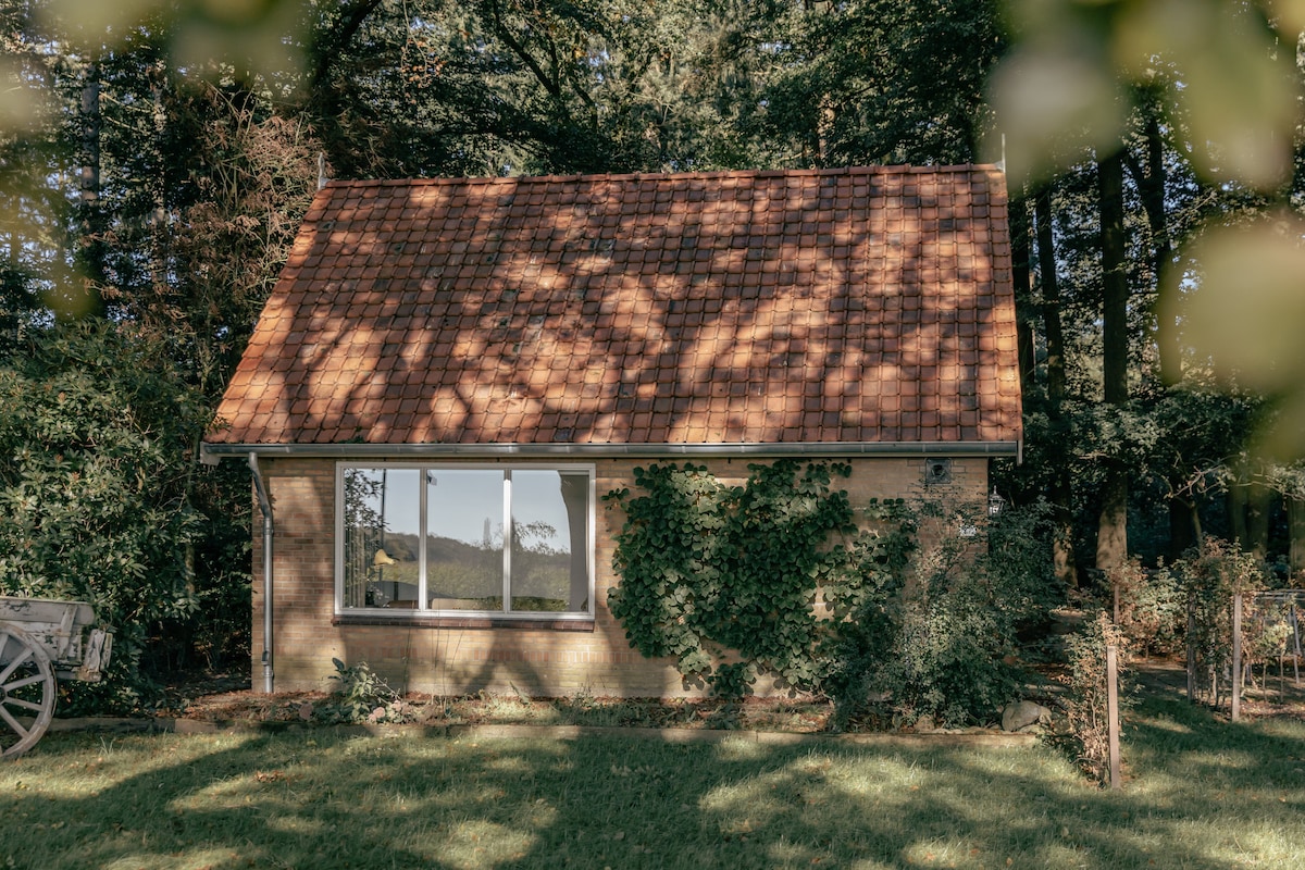Stemningsfullt skogshus med stor hage