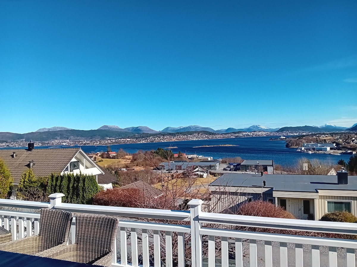 Stor romslig funkisbolig med fantastisk utsikt! Kort vei til fjell, sjø og by! Huset ligger i et fredfullt og barnevennlig område. Rett nedom huset ligger en idyllisk badestrand, 5 minutt å gå ned til båt som tar deg rett til Ålesund sentrum på noen få minutter. Ellers har du Moa, stort shoppingsenter som bare ligger 15-20 min unna med bil. Kort spasertur til Devoldfabrikken som er et koselig outletsenter. Med mange kjente merkevarer, kunstnere og kafe.
