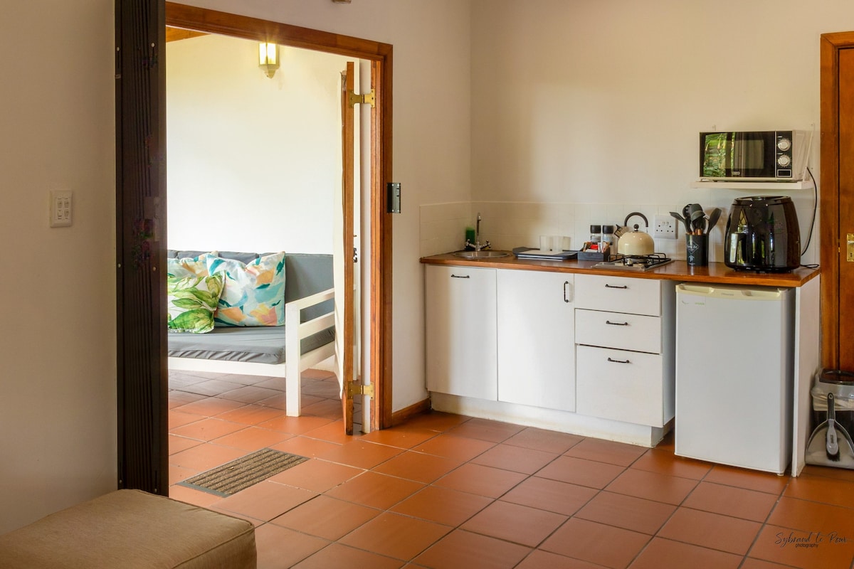 Denne koselige hytta med åpen planløsning har en dobbeltseng og et eget bad med dusj. Enheten har et tekjøkken med induksjonsplate og et lite spisebord med sitteplasser. Ute er det en boma braai/grill med utsikt mot fjell og hage.