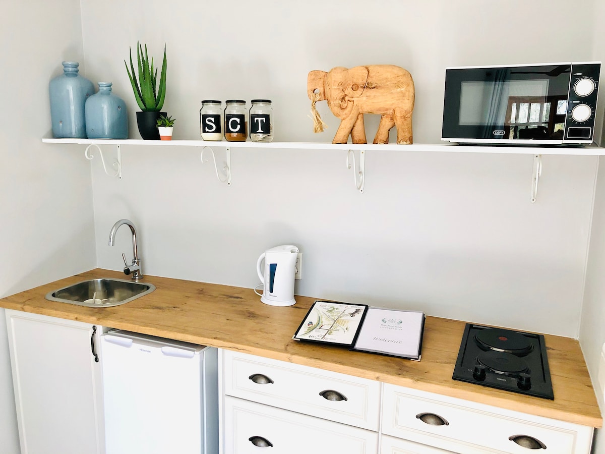 Klimaanlegged deluxe familierom med én kingsize-seng og et interleading rom med to enkeltsenger - egnet for en familie på fire personer. Eget bad kun med dusj. Kjøkken med kjøleskap og mikro og fullt utstyrt for selvbetjening, Braai-området i hagen. Egen inngang og terrasse. Frokost er tilgjengelig for R130 per person. Vi tilbyr game drives til Addo Elephant Park samt private viltreservater.