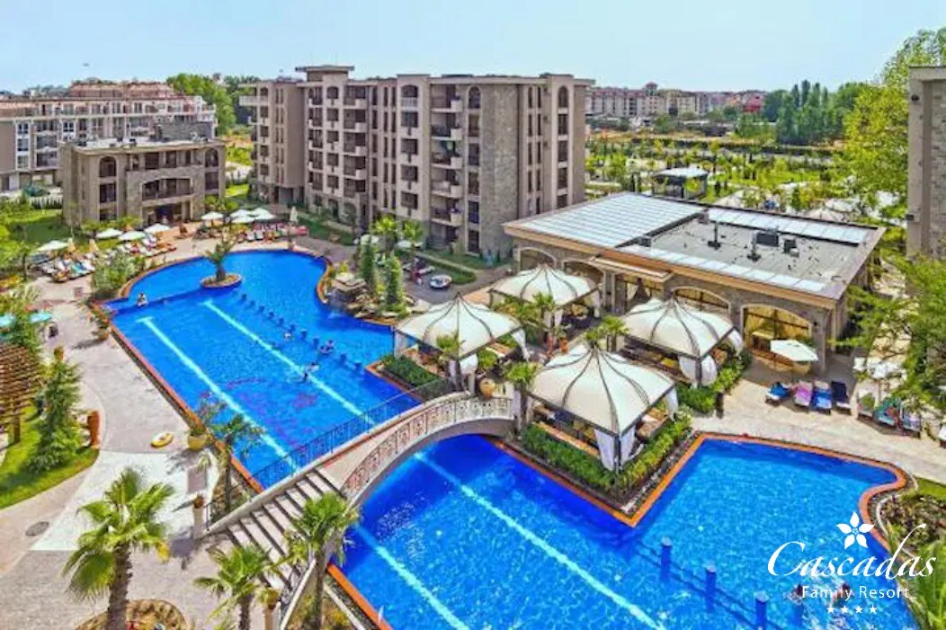 Familie-leilighetshotellet Cascadas Resort ligger i Sunny Beach, bare 600 meter fra stranden og 9 minutters gange. Gjestene kan nyte 3 restauranter, 10 utendørsbassenger med ferskvann og sjøvann med barneområder, med bassengbarer. Gratis trådløst nettverk i hele eiendommen. Aquapark ligger ti minutter unna. Gjestene kan nyte et gratis treningssenter og spa med boblebad og dampbad. Den tilbyr en tema økopark, to mini vannparker og daglige underholdningsaktiviteter for barn.