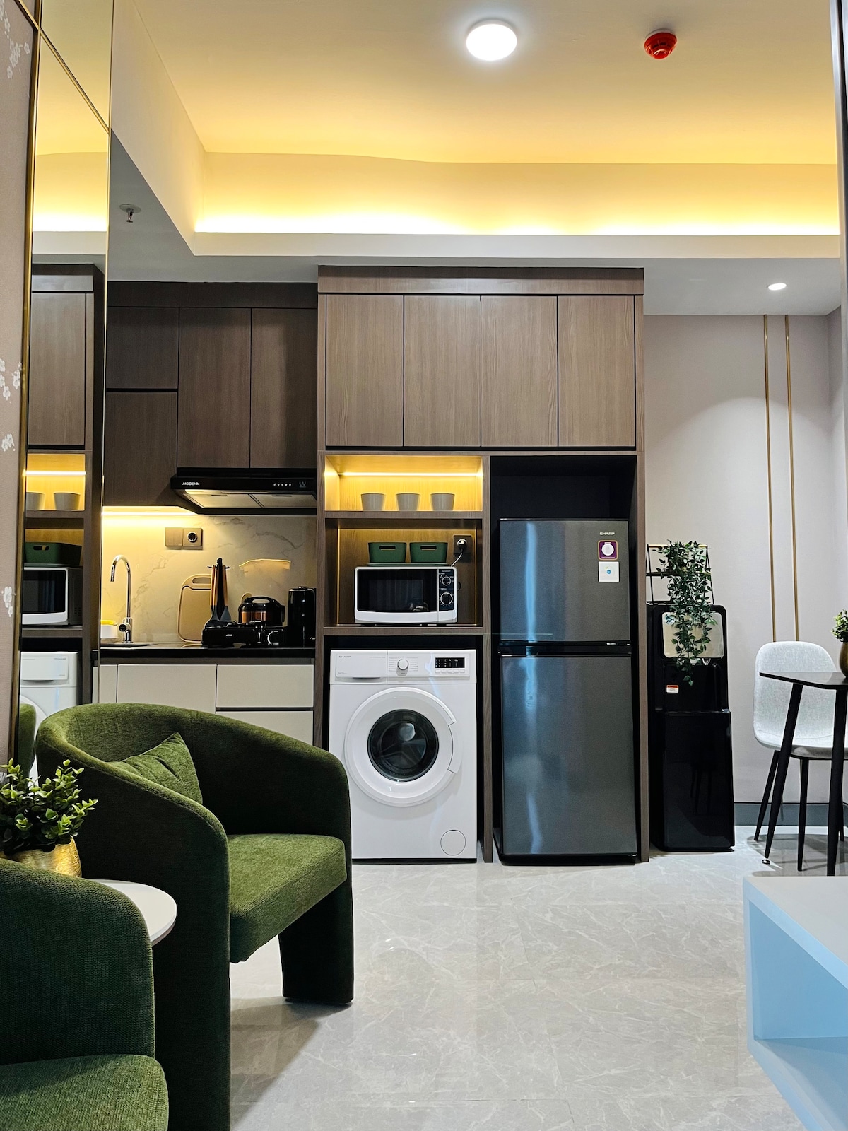 Moderne studio ved Bella Tower – koselig bolig over Pakuwon City Mall Nyt atmosfæren på et 5-stjerners hotell ⭐⭐⭐⭐⭐ til en rimelig pris. En luksuriøst møblert enhet og også seng og sengetøy av høy kvalitet. Helde fasiliteter: Smart dør. Fullt møblert rom. Utsikt over byen. Balkong Bad med dusj og varmtvannsbereder, håndklær, såpe og shampoo. Kjøkken med induksjonskomfyr og bestikk. Klimaanlegg, TV med Netflix, 2-dørs kjøleskap. * Røykfritt rom* ** hårføner og strykejern på forespørsel