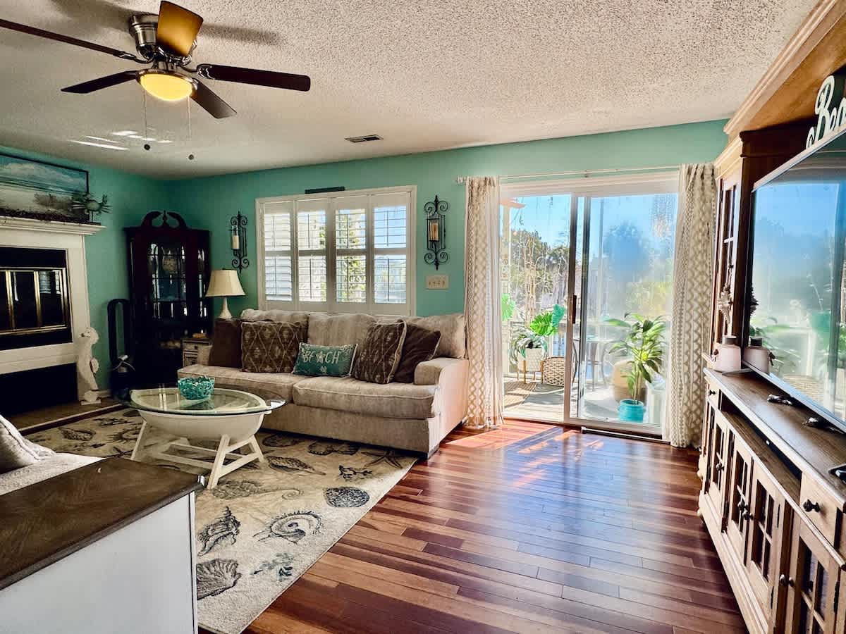Slapp av og slapp av i dette lyse feriestedet ved Surfside Beach, perfekt for par eller små familier. Denne 1BR-enheten på lavere nivå ligger i Oceanside Village med privat strandparkering og tilgang, og tilbyr komfort og bekvemmelighet i nærheten av både Surfside og Garden City Piers. Nyt et komplett kjøkken, koselig stue, queensize-seng og fasiliteter i feriestedsstil, inkludert innendørs-/utendørsbassenger, tennisbaner og treningssenter. Alt du trenger for den perfekte strandferien!