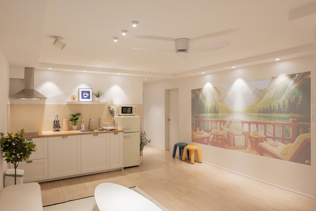 Det er et praktisk sted å bruke, rett ved siden av Seomyeon i sentrum av Busan og Jeonpo, som er populært i dag.(3 minutters gange fra utgang 1 på Jeonpo stasjon) I den store stuen er det en platespiller og høyttalere hvor du kan nyte musikk, og hver eneste gjenstand på systemhyllen er i øyesyn. I tillegg tilbys en stråleprojektor med en stor skjerm, som om du var på en kino.(Netflix, Watcha, Youtube Premium) Soverommet har en varm beige atmosfære for å gi komfort. Spillrommet har et pent interiør med grønne gjenstander i moderne stil, og en Nintendo Switch som du kan kose deg med sammen med venner og kjærester. Det store badet er praktisk, og kjøkkenet er også fint med et pent kjøleskap og moderne hvitevarer. Området rundt overnattingsstedet er utrolig stille og privat, selv om det ligger mellom Seomyeon og Jeonpo. Hvis du vil ha en avslappende pause fra sentrum, bruk Jian Forest :) Glem bekymringer og stress mens du bor i et romslig og rolig sted.
