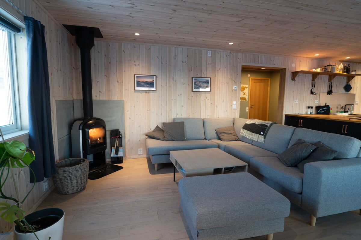 Moderne leilighet med en veldig romslig stue og store vinduer for å kunne glede seg over det arktiske panoramabet. Den har to soverom og en sovesofa i stuen, og det er komfortabelt plass til opptil seks gjester, med to personer på hvert rom. Den har alt du trenger for å føle deg som hjemme og ha en koselig kveld etter en dag full av eventyr. Leiligheten ligger ca. 600 m oppoverbakke fra sentrum, så hvis du reiser med bagasje, anbefales det sterkt å ta en taxi fra/til flyplassen.