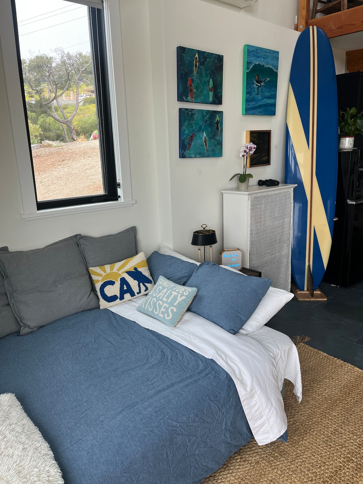 Åpne skyvedøren for å la den milde sjøbrisen vente inn og slå deg ned for å strømme et favorittprogram på Smart TV. Interiøret blander kystnære detaljer med boho chic, og det er lite luksus som en arbeidsplass og et avsidesliggende privat uteområde. Jeg overholder CDCs rengjøringsrutiner. Jeg bruker UV C-lys for ekstra desinfisering og fjerning av smittestoff fra studioet, og har også lagt til en Dyson-luftvifte og varmeapparat for å sikre at du har ren luft. Denne ettromsleiligheten ligger i første etasje i mitt treetasjes hjem. Studioleiligheten deler første etasje med garasjen, slik at du ikke har noen delte vegger. Du har to vinduer, ett på badet og en skyvedør i glass på soverommet, de bringer inn lys og sjøbrisen, men har ingen utsikt. Selv om dette studioet er privat, kan du høre fotspor over, musikk som driver inn fra andre deler av huset og lydene som kommer fra hverdagen. Du har én parkeringsplass tilgjengelig på høyre side av innkjørselen. Mer gratis parkering er vanligvis tilgjengelig i enden av gaten, 15 hus nede på Panama. Om dagen er det ekstra parkering ved barnestranden. Jeg bor i de to øverste etasjene i huset, så jeg er lett tilgjengelig for så mye eller så lite interaksjon som nødvendig. Innstillingen på en rolig gate ligger bare et halvt kvartal fra kanaløya har Kiddie Beach og 1,5 kvartaler til Silver Strand Beach, et populært surfested og utsiktspunkt for å fange solnedgangen. Se etter hvaler og oppdag et yogastudio, hjørnemarked og salong, bare noen øyeblikk unna. Hollywood ved sjøen har også unike lyder. Du vil høre sjøløver, båthorn og noen ganger et tåkehorn. Hver morgen kl. 08.00 hører du nasjonalsangen vår, og ved solnedgang hører du kraner. Du må være oppmerksom, ellers går du glipp av det. Det er noe av det jeg elsker med dette området.