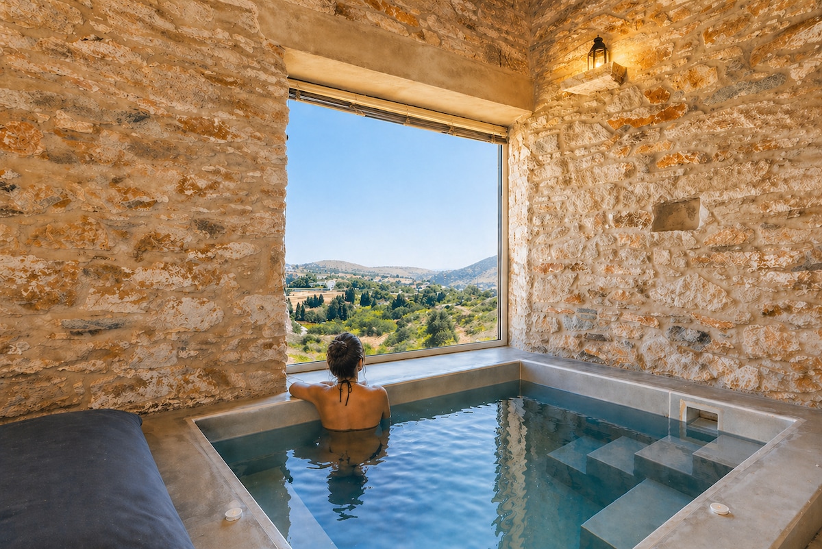 Glaukopis Retreat med privat innendørs jacuzzi.