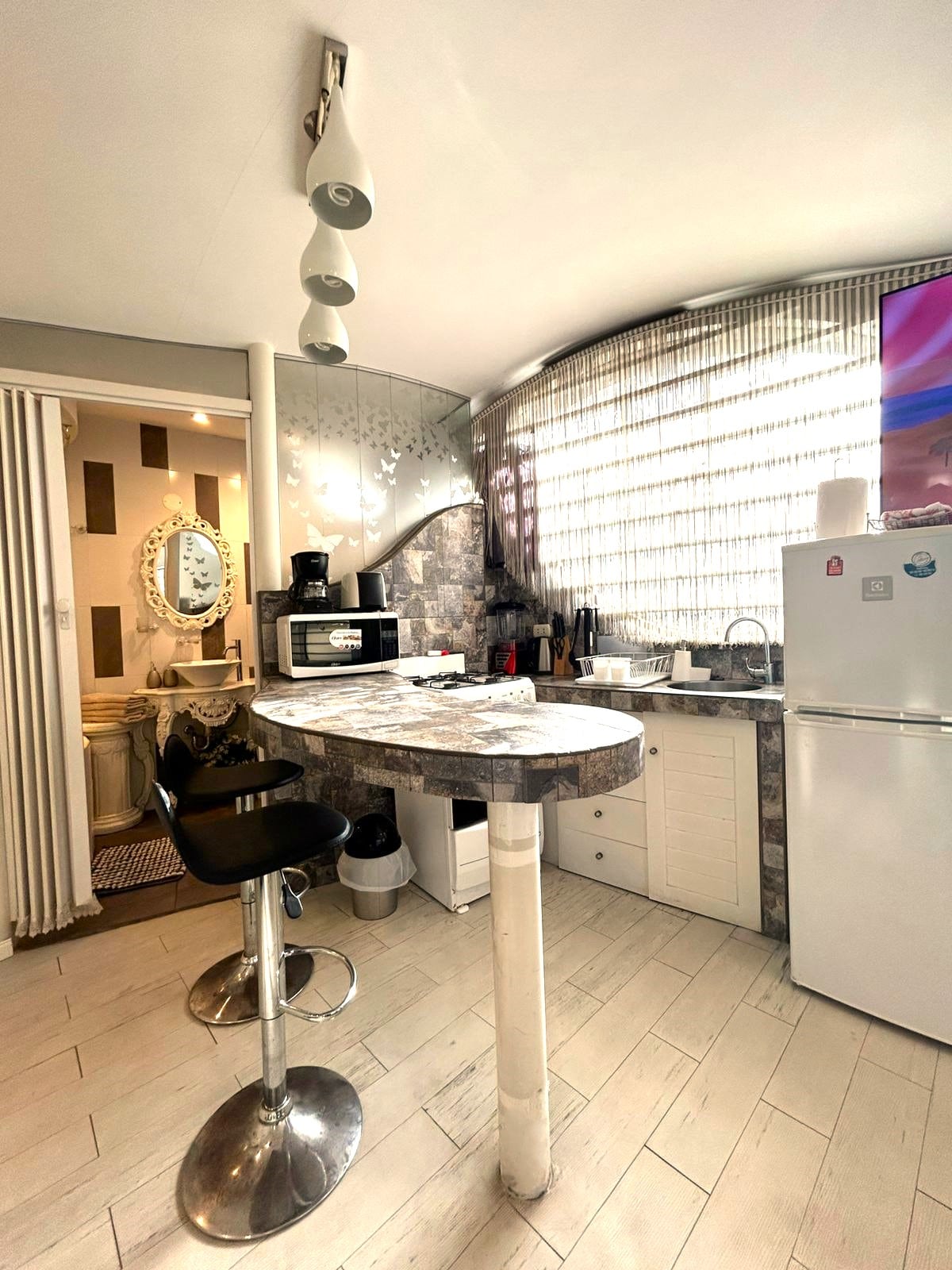 CÉNTRICO ESTUDIO DE 26 m2 CON UBICACION Y VISTA PRIVILEGIADA AL JARDIN BOTANICO DE TACNA, a pasos de lugares de interés de Tacna, cuenta con kitchenette con electrodomesticos, frigobar, mesa comedor, cama Queen, TV 43" con canales de cable, servicio higiénico privado equipado con tocador y ducha con hidromasaje. También cuenta con lavandería y tendal propio, armario, WIFI, caja de seguridad. Propiedad ubicada en quinto piso, con acceso independiente solo por escaleras amplias y con pasamanos.