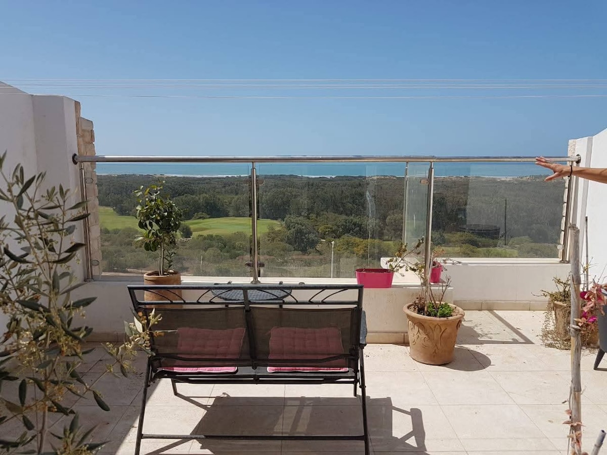 Questo gioiellino, al secondo piano in prima linea sul mare, fa parte del Residence Mogador Beach, con piscine, giardini, parking e security 24/7. Appartamento nuovo, silenzioso, con vista eccezionale sulla spiaggia, l'oceano e le isole di Essaouira. Bella cucina, ottime finestre isolanti, camera da letto matrimoniale, due bagni completi, grandissimo divano che diventa il secondo letto. È ideale per una coppia o una famiglia di 3 o 4 persone. WIFI con fibra veloce. Smart TV. No ascensore