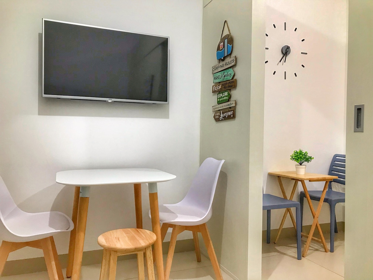 Enheten vår ligger på SMDC Wind Residences Tower 1, rett langs Aguinaldo Highway, og gir enkel tilgang til alt du trenger. Omtrent 35 kvm med en funksjonell åpen planløsning designet for komfort og avslapning. Det er utstyrt med: ✔ En kingsize-seng ✔ Ekstra gulvmadrass. ✔ Grunnleggende kjøkkenutstyr og små kjøkkenapparater ✔ Raskt og pålitelig trådløst nettverk med PLDT FIBR. ⚠️ Merk: Det er ingen tilgjengelig parkering i kjelleren. Parkering mot betaling er tilgjengelig på eiendommen.