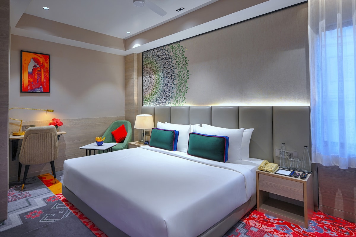 Dette deluxe-rommet har én stor seng eller to enkeltsenger, sammen med en ekstra seng, perfekt for opptil tre gjester. Dette Airbnb-stedet ligger bare fem minutter fra Taj Mahals inngangsport, og tilbyr et plettfritt, godt vedlikeholdt sted med eksepsjonelle servicestandarder. Nyt et svømmebasseng, en bar, et treningsstudio, spa og koselige senger - alt du trenger for et perfekt opphold. Det hjelpsomme og oppmerksomme personalet er alltid klare til å hjelpe deg. Enten du reiser i fritiden eller på jobb, sørger vi for en minneverdig gjestfrihetsopplevelse.