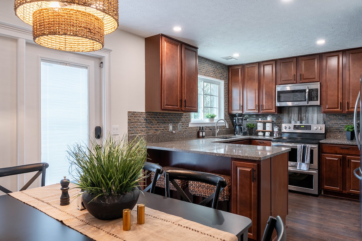 1 king bedroom guest suite in a modern farmhouse style duplex. This unit has a private entrance in the front and has small covered porch with 2 rocking chairs. There is another listing adjacent to this one that enters from back. Living area w/ high vaulted ceilings, kitchenette w/ island and bar stools, private bathroom w/ walk in shower. Private parking in front of unit. All linens and basic supplies provided. Please see other listing details for specifics on exactly what is provided.