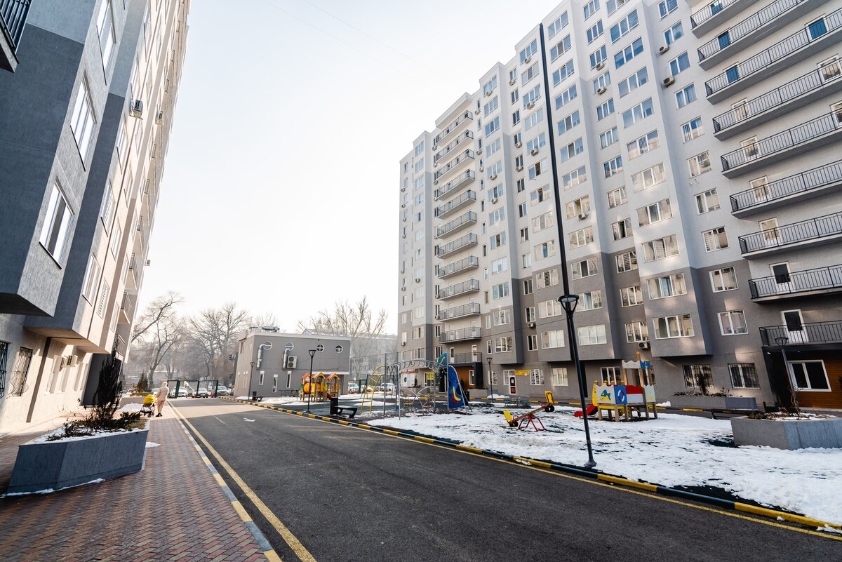 New Raymbek boligkompleks, motsatt er T-banen, nær gågaten Arbat, Green Bazaar, mange supermarkeder i selve boligkomplekset og Theater of Youth. Du trenger ikke å ta med vann, det er et vannfilter. Leiligheten ligger i sjette etasje, og vinduene har utsikt over hagen. Det er en holdeplass i nærheten, hvor du kan dra til fjellet med buss nr. 12. Det er en døgnåpen matbutikk på stedet. Om morgenen kan du spise frokost på kaféen, som ligger i samme hus.