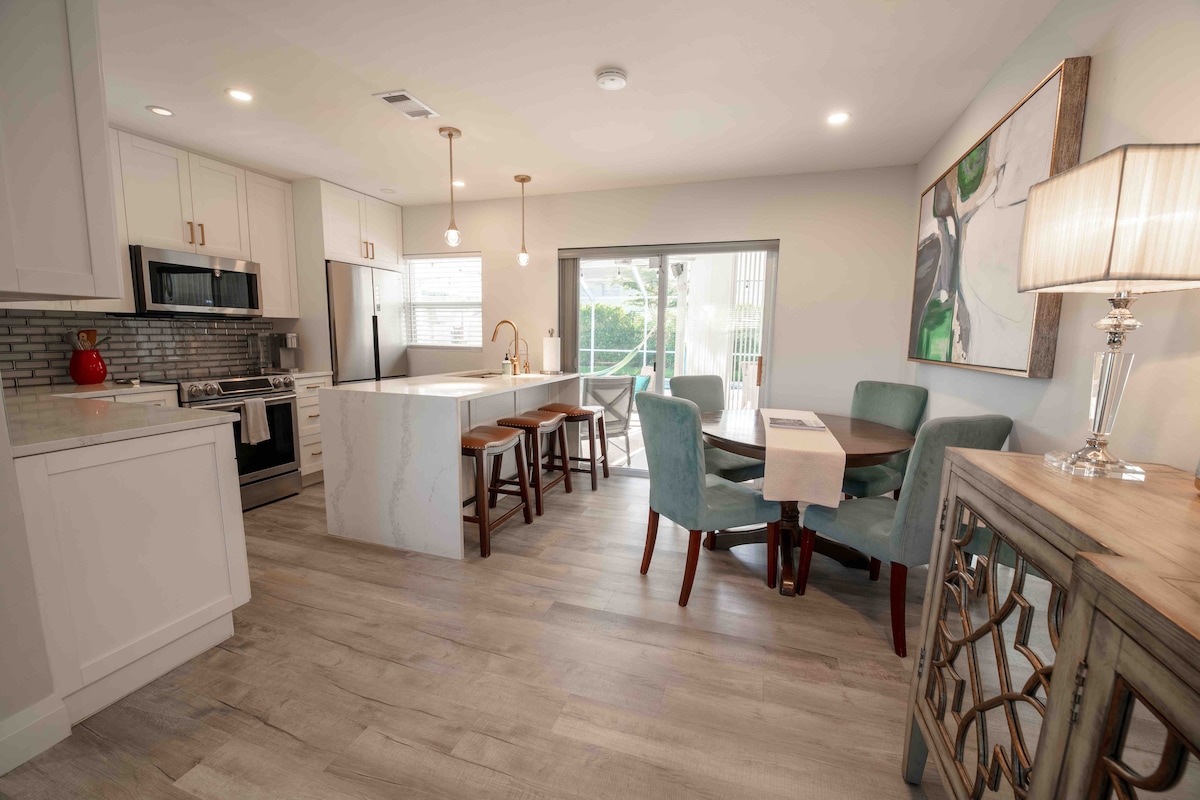 Velkommen til Happy Place! Dette fullstendig renoverte feriestedet i Naples har plass til seks personer og blander moderne komfort med familiemoro. Nyt et lyst, åpent oppholdsrom, et profesjonelt kjøkken og tre soverom, inkludert et hovedsoverom med tilgang til bassenget. Gå ut til din private skjermede oase med oppvarmet basseng, sitteplass, grill, kanal og utsikt mot golfbanen. Garasjens spillrom tilbyr bordtennis, fotball og arkadebasketball. Bare få minutter fra strender, spisesteder og sentrum, er det den perfekte ferien for avslapning og lek.