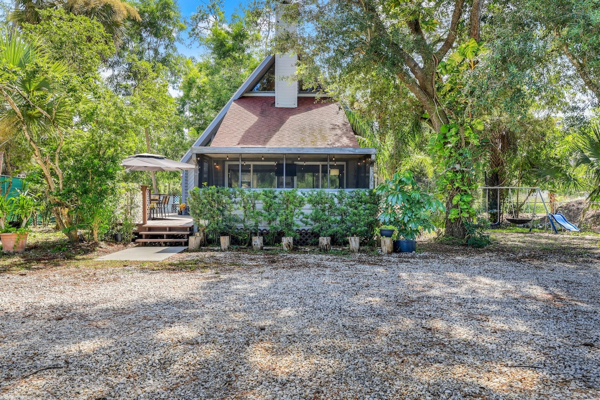 Ta det med ro på denne unike og rolige utflukten. En vakkert innredet seng og bad i en egen bygning fra huset. Vi har geiter, esler og kyllinger og en høylandsku, alle supervennlige. Sitt og slapp av på din private, vakre lanai eller et av gårdsbordene våre som er plassert rundt eiendommen. Bli med oss når vi mater dyrene. Eller bli med på et av Goat Yoga-kursene våre! Vi ligger i nærheten av I-75, flyplasser, shopping, strender, sentrum. Perfekt for par eller alenereisende.