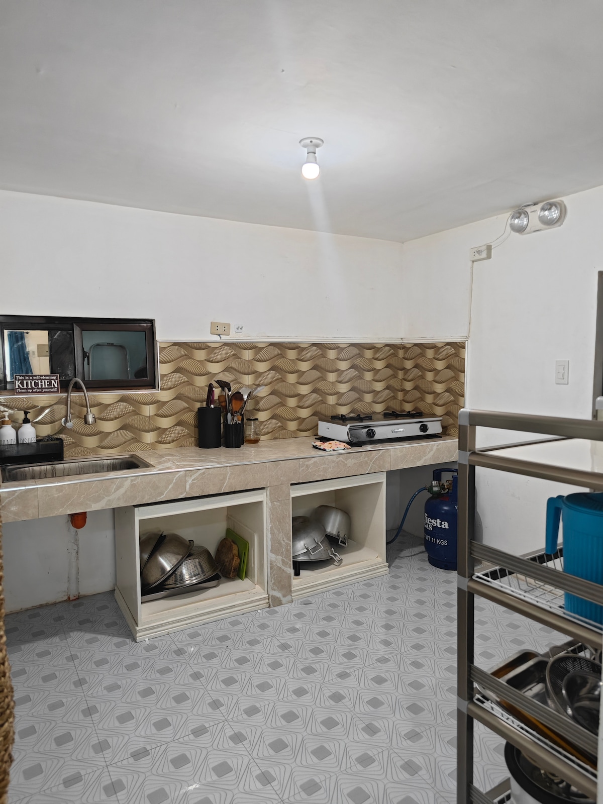Åpent konsept, romslig, fullt utstyrt med aircondition og nødgenerator for hele huset/villaen, med et stort, fullt utstyrt kjøkken og en sentral øy. Enorm utendørs terrasse, og en foajé med koselig sitteplass. Romslige rom. Innendørs garasje og utendørs parkering er tilgjengelig. Bare 10–12 minutter med bil til Hundred Islands Wharf og 2–5 minutter med bil til dagligvarebutikker, hurtigmatkjeder og den nye døgnåpne Jollibee for å nyte den vakre byen Alaminos. Ideelt for familier og vennegjenger å utforske.