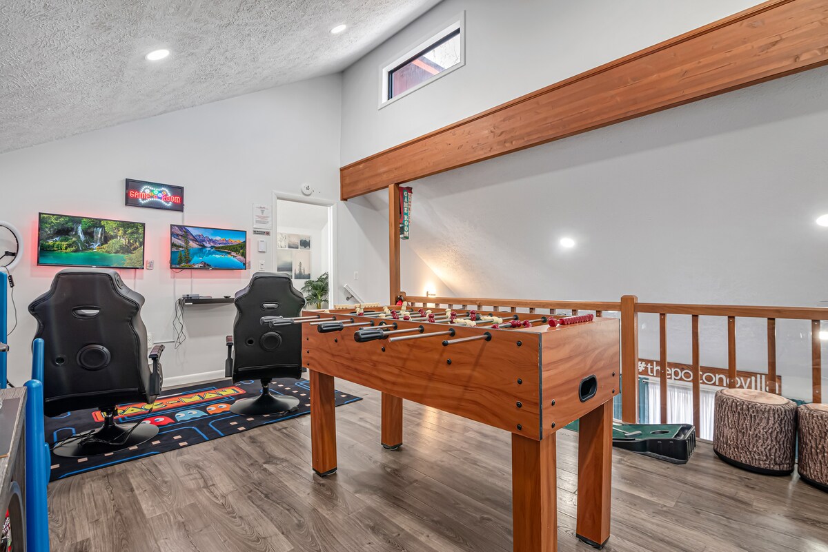 Velkommen til Pocono Villa! Det perfekte stedet å komme og nyte naturens unike, fredelige og forfriskende atmosfære i dette vakre hjemmet med tre soverom og to bad, som ligger i et femstjerners inngjerdet område. ♨️ Badestamp 🕹️ Spillrom 🧖♀️ Privat badstue 🔥 Innendørs peis + utendørs bålplass. 🏋️♂️ Treningsrom