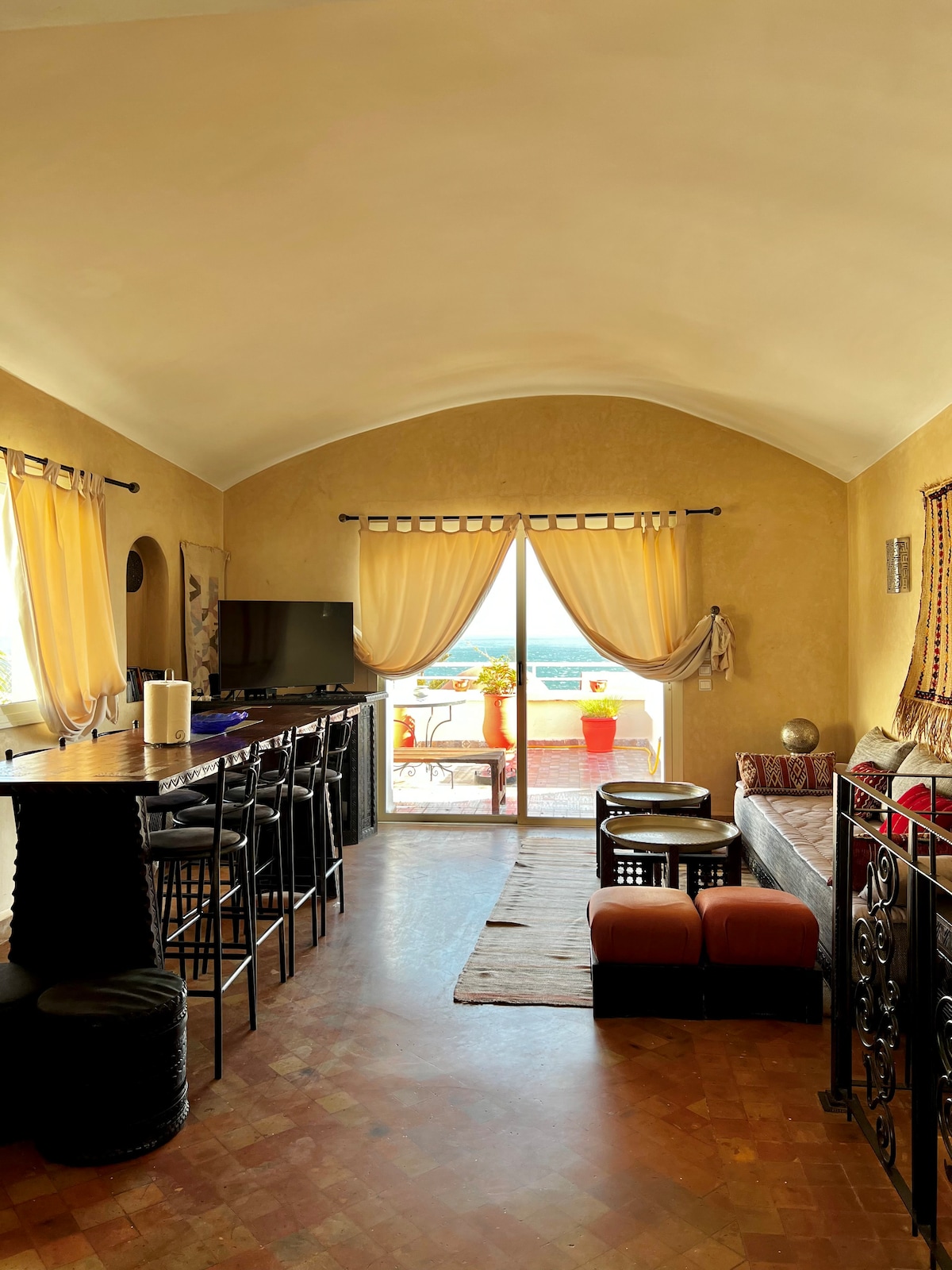 🌊 Dar Mogador Sun – elegant ferie mellom hav, fjell og berbertradisjoner I den fargerike landsbyen Aghroud, livlig om sommeren, vender denne sjarmerende riaden mot Atlanteren og tilbyr spektakulær utsikt over stranden og havet. Hver soloppgang og solnedgang blir et magisk øyeblikk. 30 km fra Agadir og 10 minutter fra Taghazout surfesteder, kombinerer det marokkansk autentisitet, moderne komfort og en beroligende atmosfære. 🚗 Tilgang med bil er viktig. Gratis parkering foran huset.