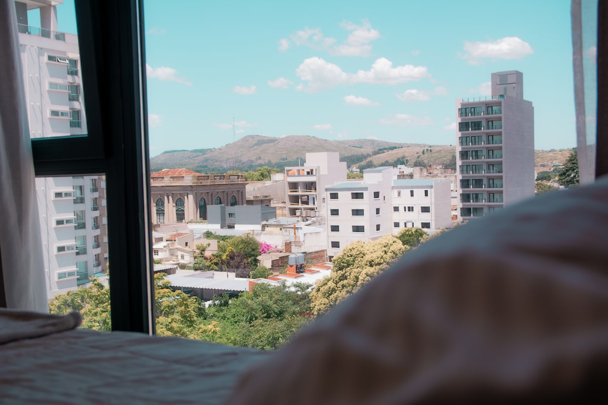 Dette stedet er SPESIELT, du kommer til å ønske å komme tilbake! Leilighet ved foten av El Cerrito-parken og midt i Tandil. Unik beliggenhet, alt innen rekkevidde, fjellene å vandre i, fysisk aktivitet, og byen med alt det gastronomiske, kulturelle og turisttilbudet. Meget lyst, vinduer i alle rom, vakker utsikt, soverom med store skap, komplett bad, stue med utmerket sovesofa, stor balkong med utsikt over parken og overdekket garasje med elektrisk port. Ikke nøl!
