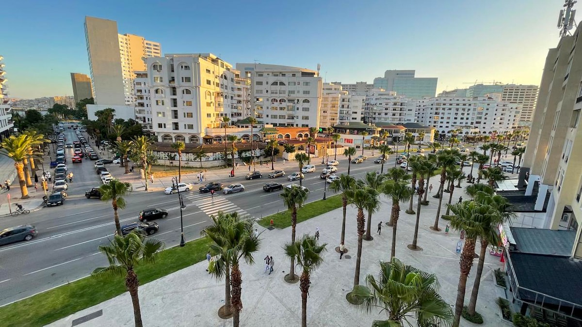 Bienvenue dans notre Moderne Appartement à 2 pas de la plage 🏖️, idéal pour familles ou amis. -Chambre parentale avec lit standard et vue mer 🛏️. -Deuxième chambre avec deux lits 90cm une personne, vue mer. -Salon moderne et lumineux 🛋️ avec vue mer. -Balcon ensoleillé 🌅 vue sur mer. -Cuisine américaine moderne et équipée 🍴. -Calme, raffiné et proche des commodités : cafés, restaurants et promenade. Parfait pour un séjour inoubliable à Tanger.