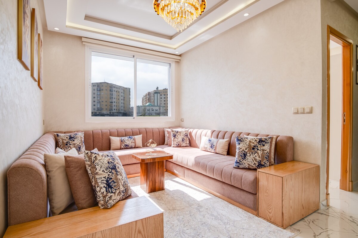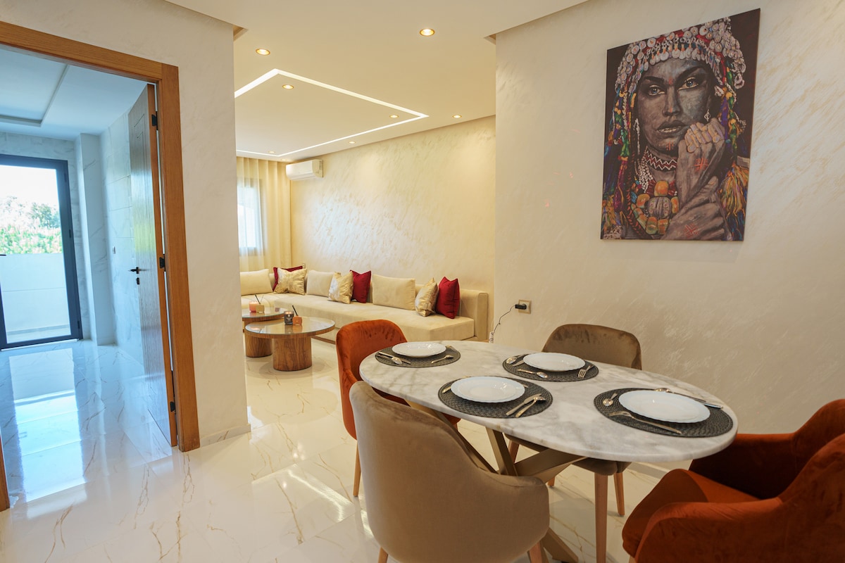 Ashraf Home offers an exceptional luxury stay in a modern and refined apartment within secure residence with private Parking. Appart Recently renovated and tastefully furnished, it delivers premium comfort,Wi-Fi🛜,Ideally located, close to beaches, shops and cafes, 8 minutes from the airport, 2 min from the Grand Stadium, 5 min from Achakar Beach🌊 and 11 min from the city center. The features two spacious living rooms, a fully equipped kitchen, Bathroom and two elegant bedrooms, Book now ! 🎉