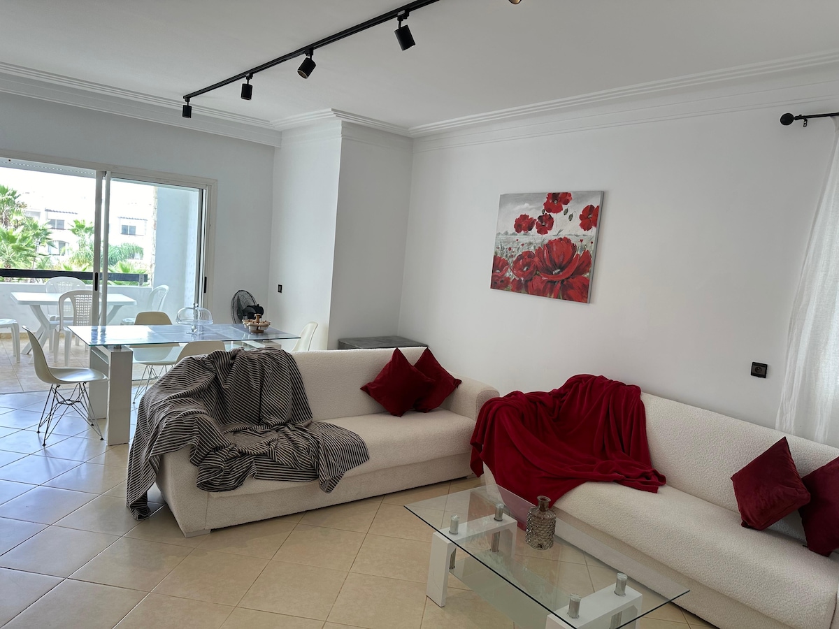 Leiligheten har to soverom og ligger i nærheten av alle severdigheter og fasiliteter. - Tre minutters gange fra stranden. - Ett minutts gange fra cornichen. - 10 minutters gange til TGV-stasjonen og City Mall Tangier. - Bygningen er sikker døgnet rundt(kamera ved inngangen og concierge) . - Gratis parkering er tilgjengelig på stedet. – Bassenget utenfor bygningen ligger fem minutters gange unna. – Bassenget er åpent i juli og august. – Basseng tilgjengelig for alle. Gratis bading for fire personer, deretter 40 DH/ekstra pers.