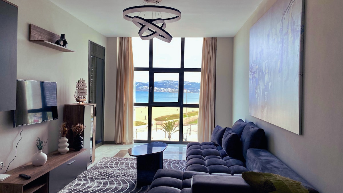 Våkne til lyden av bølger og fantastisk utsikt over Middelhavet, Tangier Bay og til og med Spania. Denne leiligheten med 2 soverom ved sjøen i ettertraktede Malabata tilbyr panoramautsikt fra alle rom, terrasser, direkte tilgang til stranden, et komplett kjøkken, en smart-TV, raskt trådløst nettverk, klimaanlegg og inngjerdet parkering. Bare fem minutters gange til kafeer, Villa Harris Park og Mogador Hotel. 11 minutter til Grand Socco. ⚠️ Ligger i andre etasje (60 trinn fra garasjen), ingen heis. 👶 Babyseng og barnestol er tilgjengelig ved forespørsel.