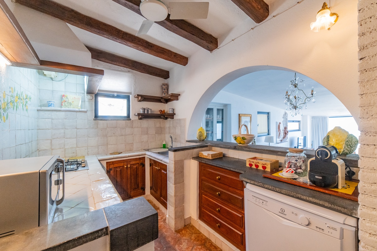 Appartamento di 120 mq con terrazzo: luminoso, silenzioso, elegantemente arredato in stile siciliano. Una vera casa ricca di personalità, con mobili antichi, ferro battuto, pietra lavica e terrecotte lavorate da sapienti artigiani che raccontano tutta la bellezza e la forza di questa terra. Le grandi finestre permettono sempre di vedere il mare quando si è in casa. Il delizioso terrazzo vi consentirà di godere di ogni momento: pranzare, leggere un libro e bere un buon bicchiere di vino.