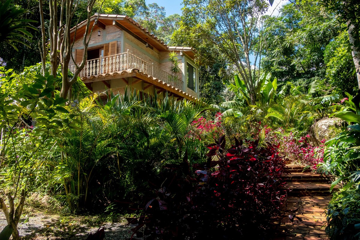 Koselig jungelhytte pluss en separat bungalow i hjertet av den brasilianske tropiske regnskogen Mata Atlântica. Ideelt for fuglekikking, fotturer, terrengsykling, besøk til fossefall eller bare å slappe av i en rolig, grønn regnskog. Vannet kommer fra den naturlige elvekilden ved siden av huset. Huset har to sovesaler med senger, bad, kjøkken med både vanlige og trevevde møbler og en liten stue. Bungaloen har et rom+bad med varmt vann og en stor kingsize-seng. Gratis trådløst nettverk (15 MB).