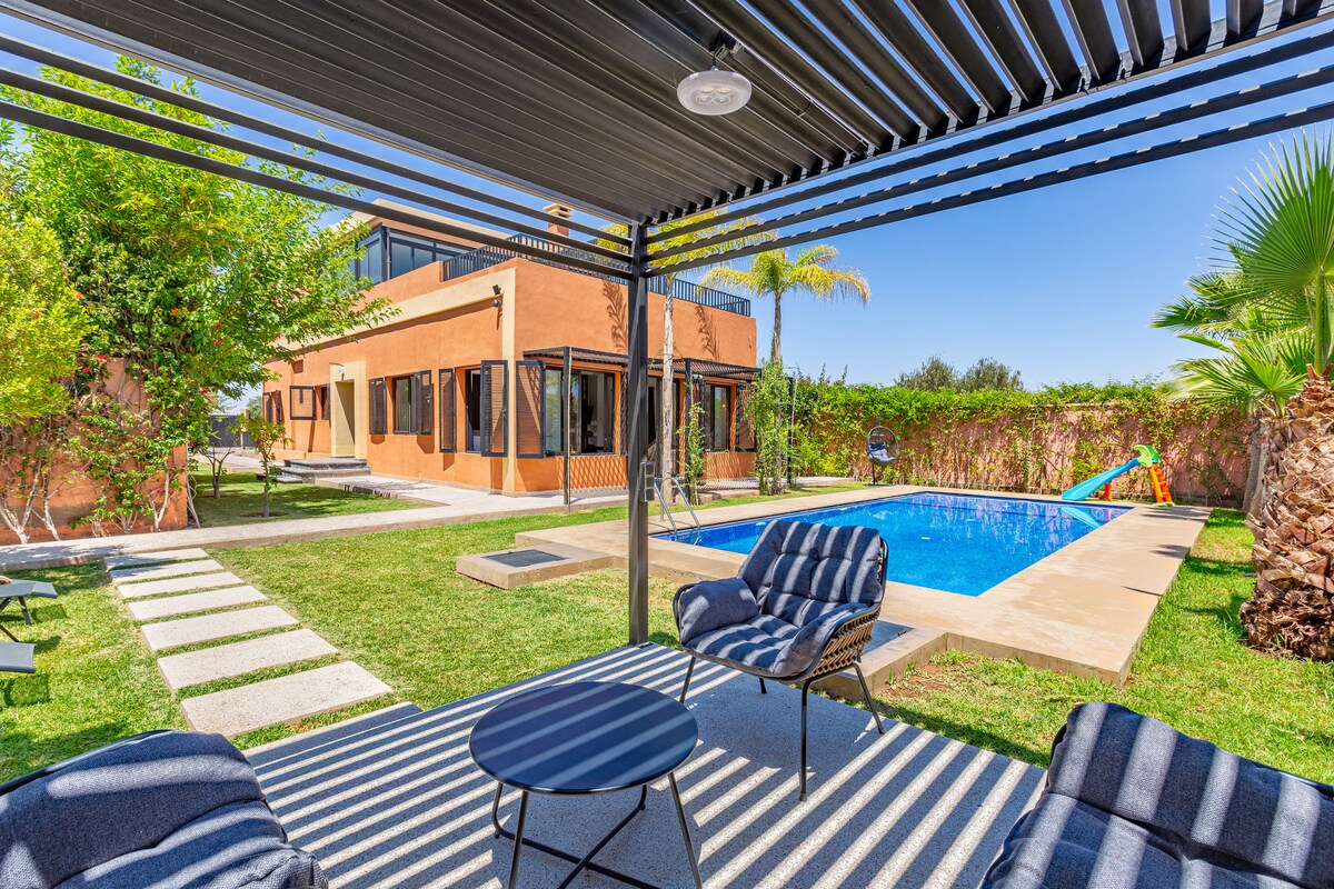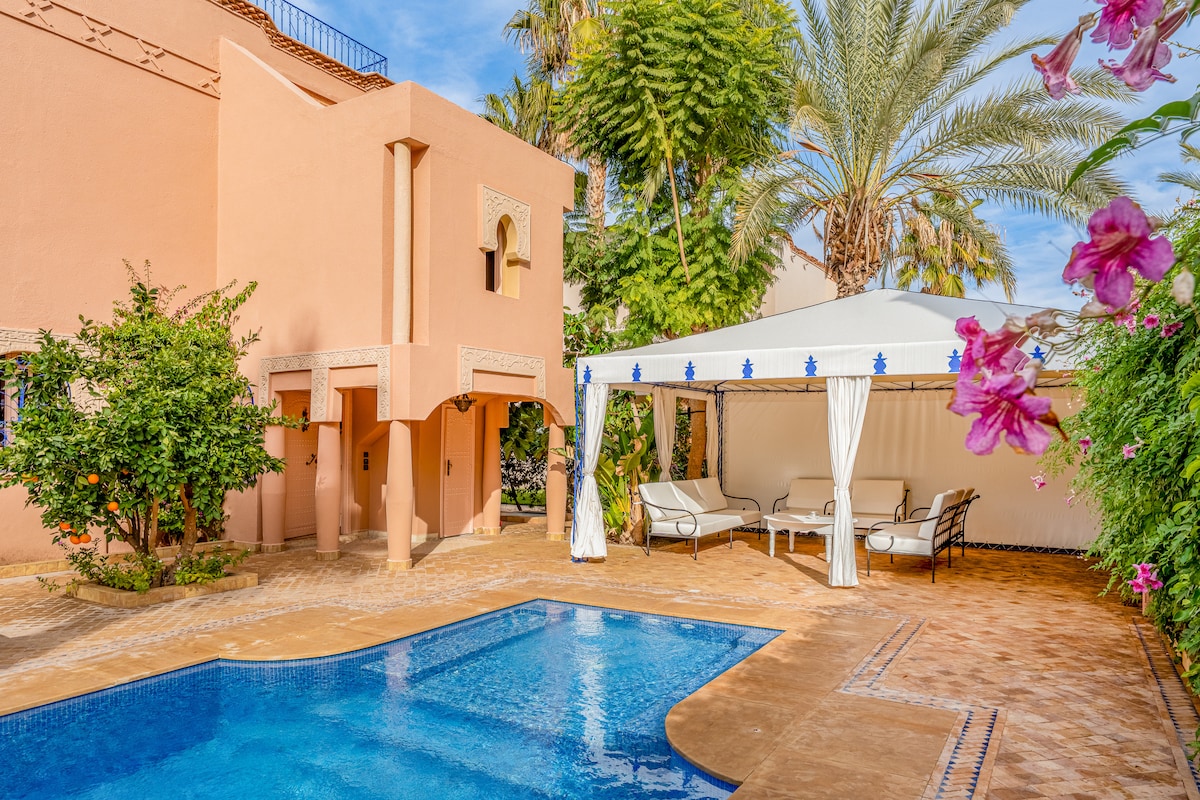 Villaen ligger +/- 30 minutter fra Gueliz og Medina i en sjarmerende døgnåpen og sikker eiendom med en felles tennisbane og et privat basseng. Villaen består av tre veldig store suiter, hver med peis, TV (gratis Netflix), tre bad, et lite oppvarmet innendørsbasseng, et privat utendørsbasseng og en privat hage uten innsyn, en stue med peis. Spisebord som kan gjøres om til et biljardbord eller pingpongbord. Stille villa.